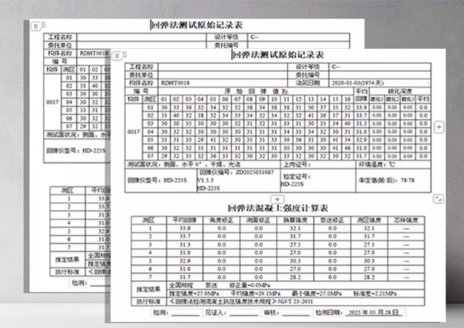 自动识别水平、顶面、侧面等冲击角度,实时修正碳化深度与浇筑面差异,强度推定范围10–60 MPa。