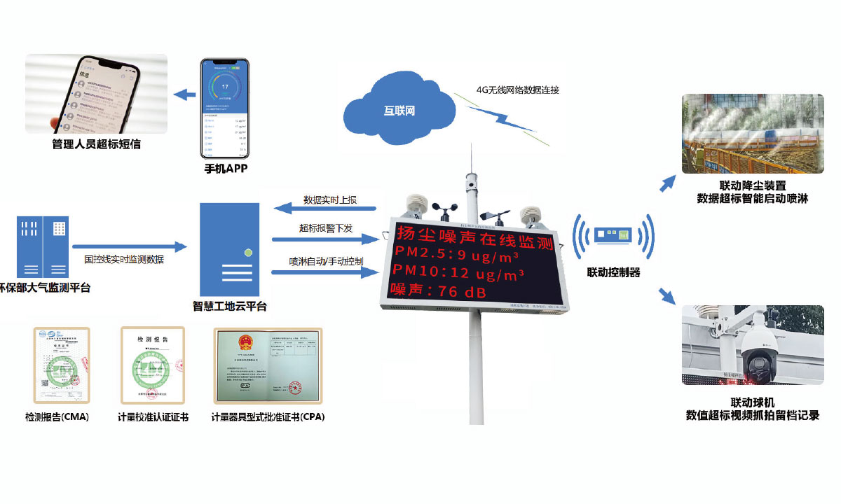 PM10/噪声超标即刻触发4G语音报警器、雾炮/喷淋自动启动,实现“监测-报警-治理”秒级闭环。